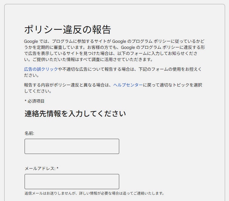 そうした場合は、以下の「ポリシー違反の報告」から不正行為の報告が可能となっています。